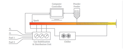 HVOF system used to develop wear resistant coatings for Aero engine, Power, Paper, Oil & refinery Sectors.In High Velocity Oxy Fuel (HVOF) Spray System, Continuous combustion of the oxygen and fuel gas occurs in the combustion chamber and the resulting hot, high pressure gas is allowed to expand and accelerate through orifices into the nozzle. A carefully measured flow of powder is introduced axially into the nozzle, allowing sufficient heating and acceleration of the powder particles. The powder is heated and accelerated by the products of the combustion, usually to temperatures above its melting point and to velocities approaching supersonic velocities.
