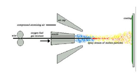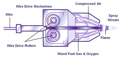 Flame spraying can be seen as a similar concept to paint spraying. Once the system is connected up, the sprayer operates a valve to start the gasses flowing and lights the gas stream. A wire isr fed into the flame and the coating is deposited in a similar way to spray painting. These systems are used to reclaim surfaces by applying a similar material or give the surface different properties by coating it with a different material. Most metals can have an aluminum coating applied by the flame spray process. This can be for aesthetic, anti-corrosion, conductivity or many other reasons. Zinc can also be applied to most substrates using the flame spray process. This is often to provide galvanic protection of the substrate, but may be for a number of other reasons.